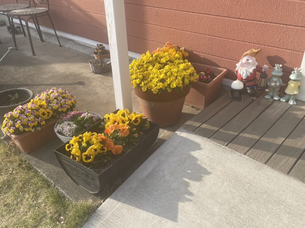 パンジーやビオラたちが今が盛りと元気に咲いていて、通ってくる生徒さんたちを明るく見守ってくれています。