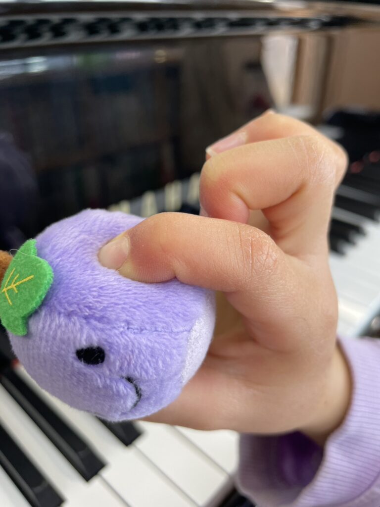今日は先生と「引っ張りっこゲーム」に挑戦!先生にぶどうちゃんを取られないよう、指先にしっかり力を込めて「つかむ」練習です。ゲーム感覚で競い合ううちに、演奏に不可欠な「強い指先」が自然と育てていきます。